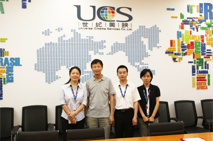 - 上海电影集团有限公司技术总监朱觉先生(左二)、世纪美映首席执行官董文洁女士(左一)、世纪美映首席技术官唐立国先生(右二)、世纪美映IT技术部经理唐海霞女士(右一)合影留念。